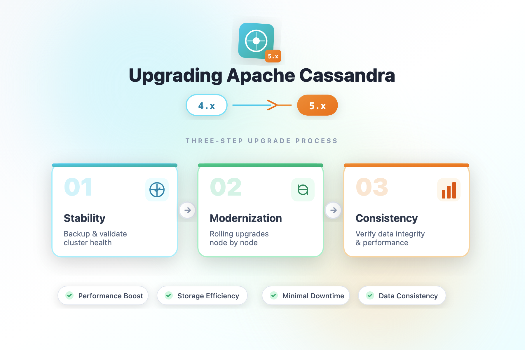 Upgrading Apache Cassandra is a critical operation that requires careful planning and execution. The transition from Cassandra 4.x to 5.x introduces significant improvements in performance and storage efficiency, but it demands a methodical approach to ensure data consistency and minimize downtime. This guide walks you through the recommended three-step upgrade process that balances stability with modernization.