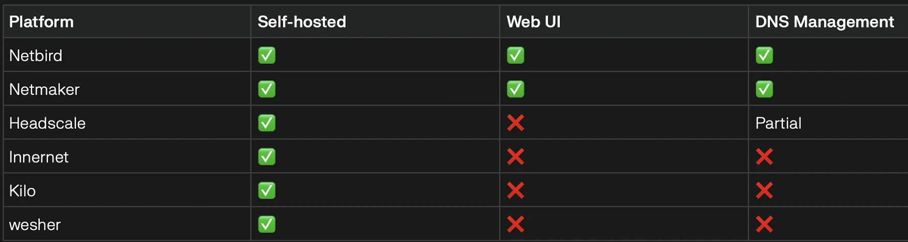 Kilo and Netbird offer Kubernetes native solutions. However, as I usually have a mixed environment with baremetal, VMs and Kubernetes, I prefer not to use these solutions.