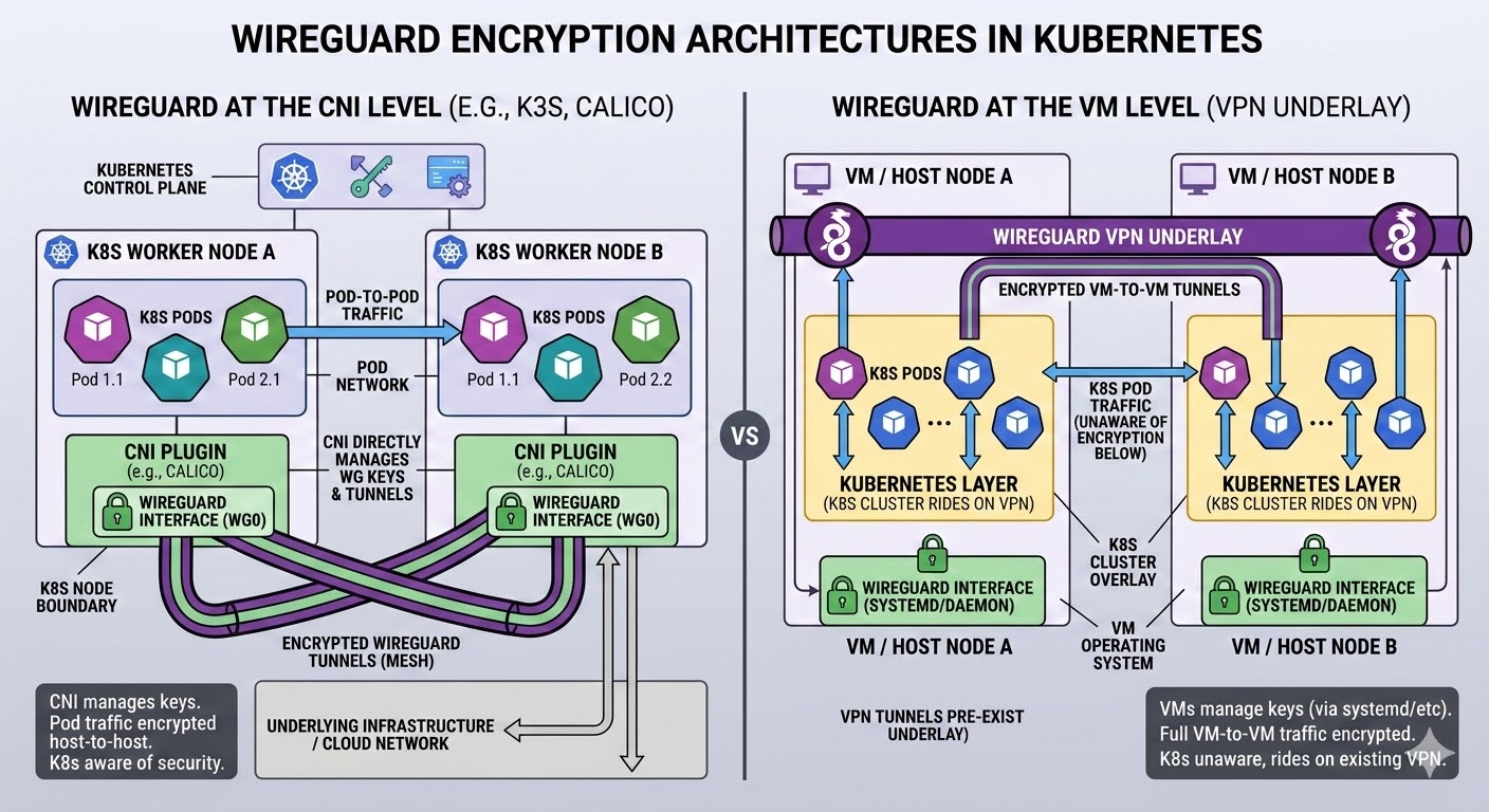 - Simplicity vs flexibility: wireguard-native is simpler and more integrated if you only care about securing intra-cluster traffic; a pre-built WireGuard network is more flexible if you also need encrypted access for non-k8s services or multi-purpose overlay networks.