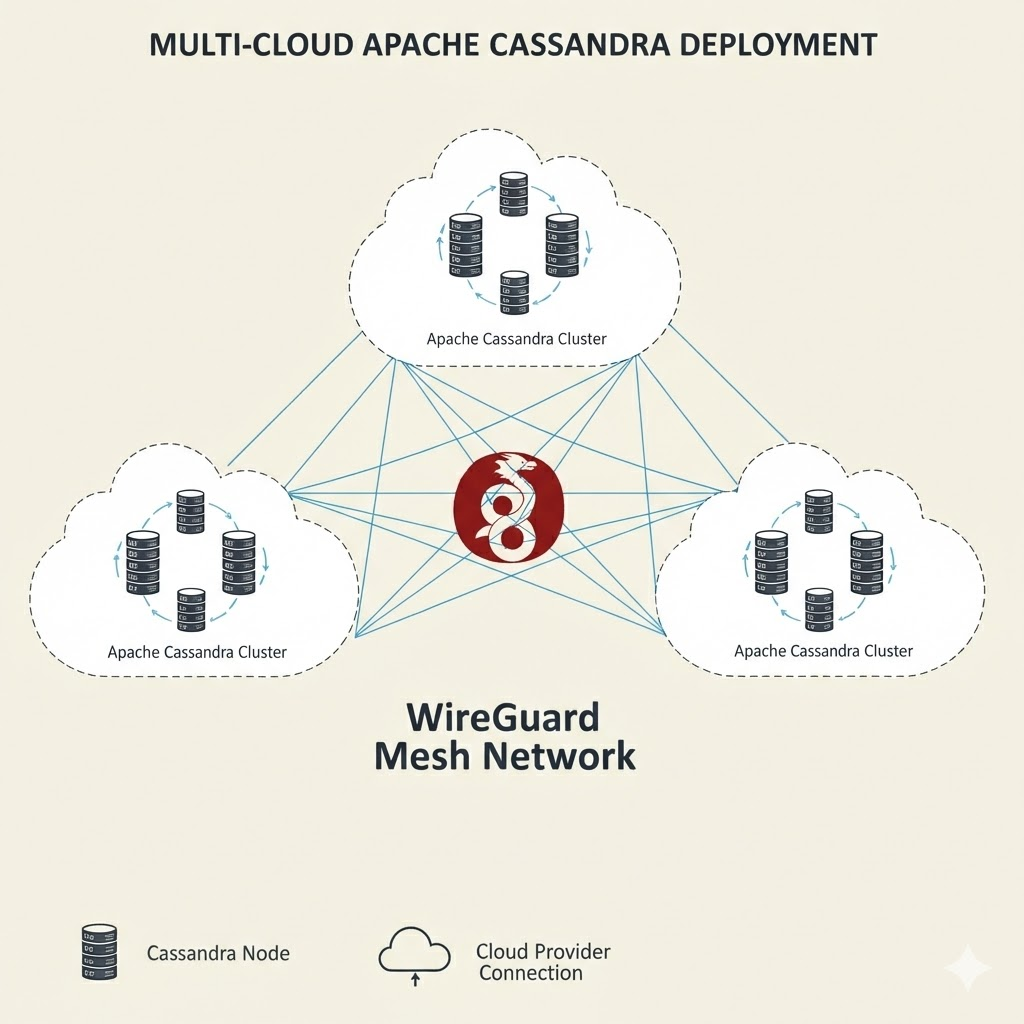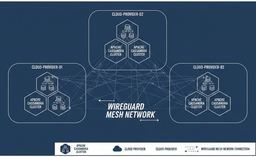 Apache Cassandra is a great example of software designed with linear scalability in mind not pinned to a single cloud or region. By overlaying a WireGuard-based-based mesh across heterogeneous providers and on‑prem sites, you can run a single Cassandra cluster spanning two or more data centres with encrypted, deterministic routing and failover paths.